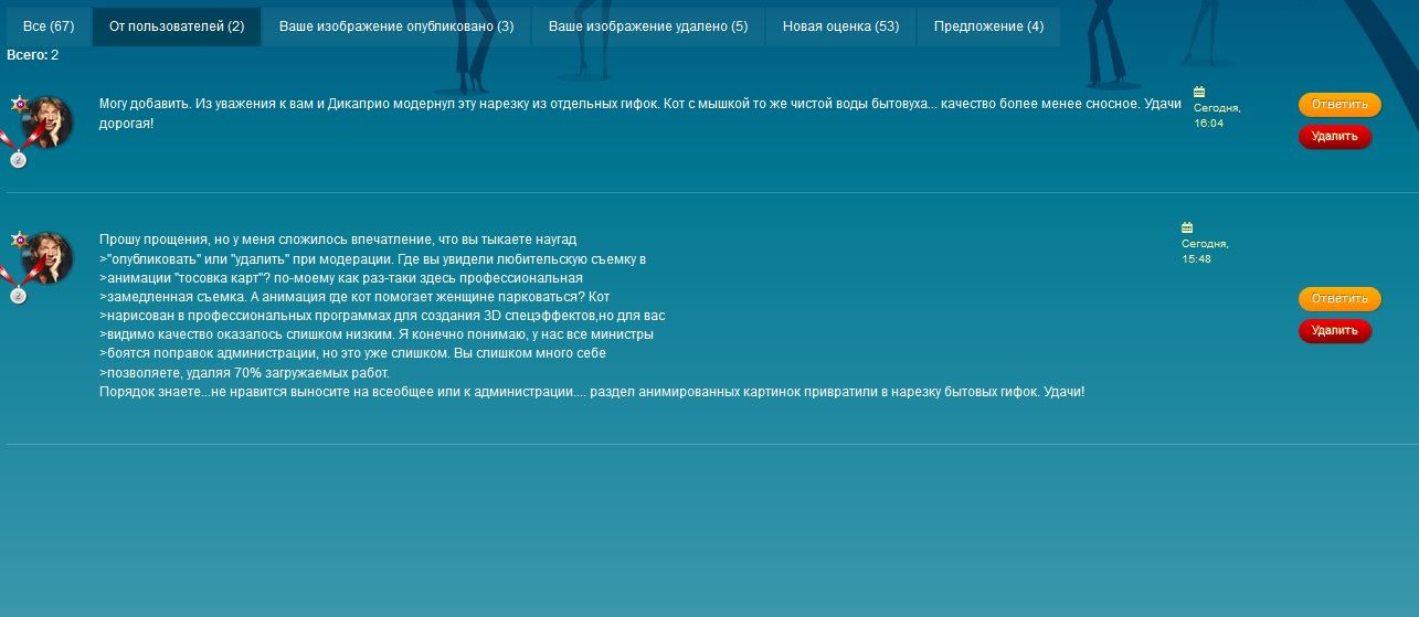 Дело в том, что сегодня я загрузила 8 работ в раздел анимации. И, к моему огромному удивлению, 5 из них были удалены министром. Посмотрев, что именно удалил, а что решил опубликовать министр - я несколько опешила... Первые две работы (привожу пример) были удалены.. первая как "бытовуха", вторая как "низкое качество"... Третья была опубликована без претензий. Почему такой выбор, как сложилось данное мнение...? Не иначе, как данный министр сидит у монитора с бубном и спрашивает совета у богов..? Я бы не удивилась, и промолчала бы, если бы из 8ми работ не опубликовали именно третью.. качество конечно не фонтан, но очень уж она потешная.. но все получилось с точностью да наоборот! 1. ![]() 2. ![]() 3. ![]() На мое (несколько гневное) сообщение пришел издевательский ответ... (тоже привожу ниже) ![]() Какой вывод я из всего этого сделала... Я, когда-то очень давно, когда министров и министерство только-только начинали вводить на этот сайт (а я помню времена, когда этого всего еще не было, и работы модерировала администрация лично), высказала мнение, что мол странно устраивать выборы каждый месяц, и что это чревато последствиями. Ведь голосование у нас идет как-то не очень обдуманно, больше похоже на "тыканье". И кто окажется министром - непредсказуемо. Скорее тот, кто первым успеет выставить кандидатуру. Меня тогда никто не послушал. Со временем я на удивление обнаружила, что по-сути ничего страшного нет в том, что министрами становятся иногда случайные пользователи, не очень опытные, так сказать. Ну да, совершают ошибки. Но часто находится тот, кто за ними ходит и исправляет. А теперь что я вижу? Появился министр, который свою должность воспринимает не иначе, как трон - мол я так решил, и хоть тресни. Это, видите ли, его, министерское авторитетное мнение. Развели тут! В разделе анимации - бытовуху! Но он-то пришел, он-то щас порядок нам тут наведет. Ну может быть, иногда, в виде исключения и из глубочайшего уважения, он позволит пройти модерацию паре-тройки холопских гифок, и то, если будет в хорошем настроении. Вот оно как! А я то, сижу на этом сайте 7 лет! Гружу какую-то фигню! Думаю, что внесла огромный вклад своими тысячами разных картинок, аватарок, обоек! А оказывается.. трачу время впустую.. не понимаю, что истинно и что ценно для этого сайта. Тем временем, вот такое "профессиональное" народное творчество свободно проходит модерацию... Не в обиду авторам!!! Лично я считаю, что это все имеет право на жизнь, ибо имеет своих поклонников на нашем ресурсе. Но я бы не сказала, что это супер качество и супер-профессиональная анимация: http://animation.99px.ru/animations/12900/ http://animation.99px.ru/animations/12912/ Ну и все остальное, похожее. Эти работы ни капельки не смутили нашего бравого министра. И я даже рада за них! Но мои-то чем не угодили..? В общем подведу итог. Пишу это не ради очередной ругани и разбирательств. Устала я от этого уже. Но просто не могу промолчать по своей натуре. Не умею. Поэтому решила так. Если этот человек в министерстве - ни одного файла от меня в его разделе не будет, принципиально. Пускай других носом тычет в их картинки, рассказывая чем они ему не понравились. Я не для того сюда загружаю изображения, стараясь идеально их оформлять, копаясь в интернете, стремясь точнее назвать, чтобы какой-то умник все удалил в два клика. Эти же работы потом загружу еще раз, в следующем месяце. Не удивлюсь, если некто "неизве